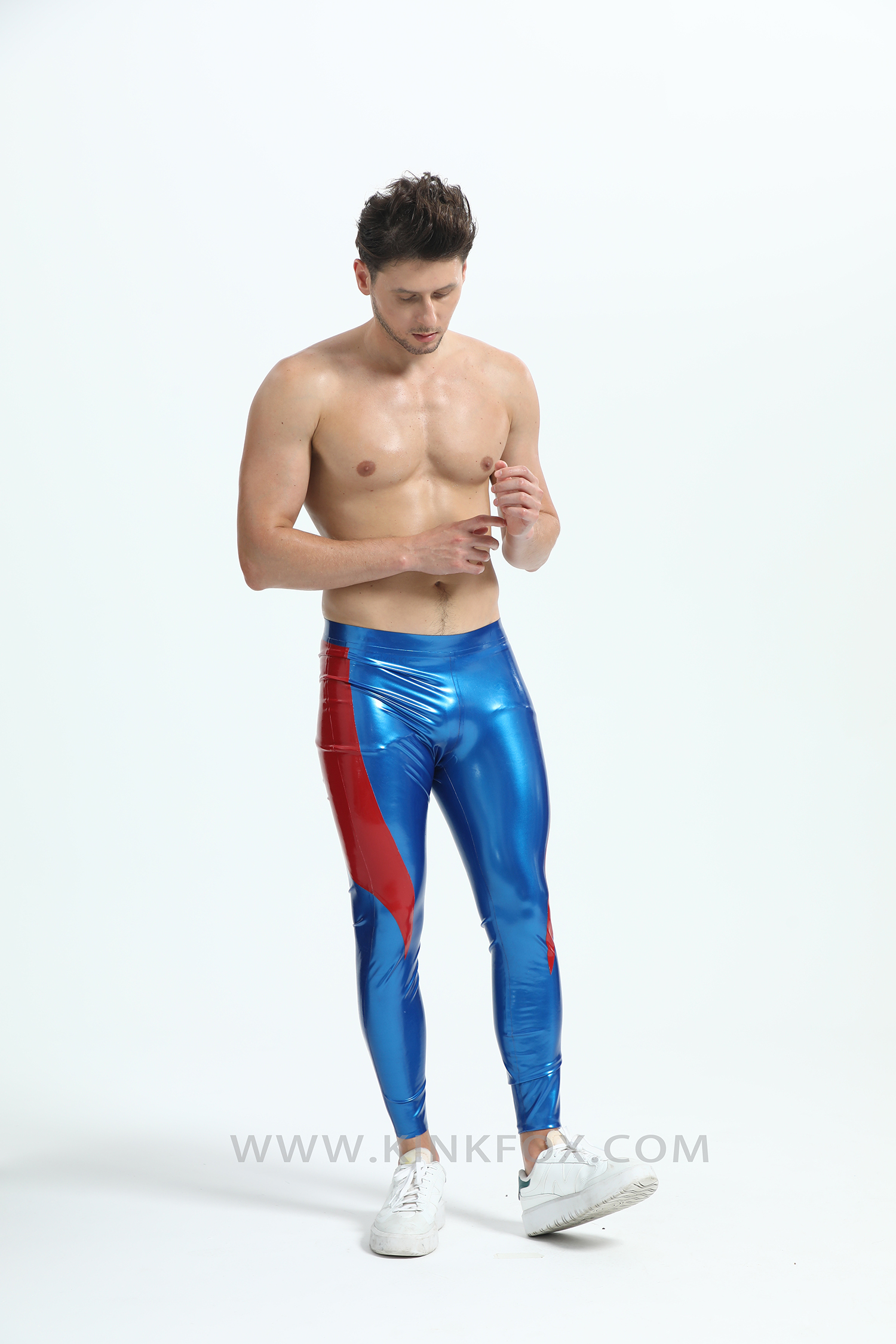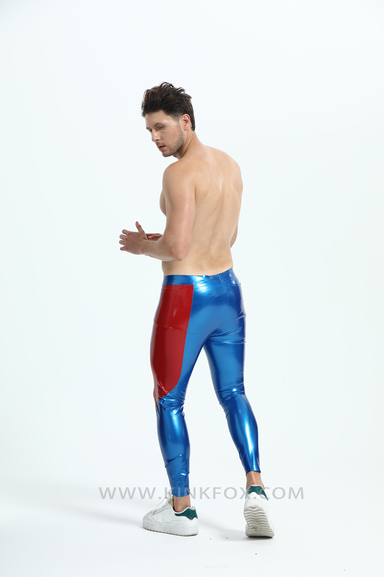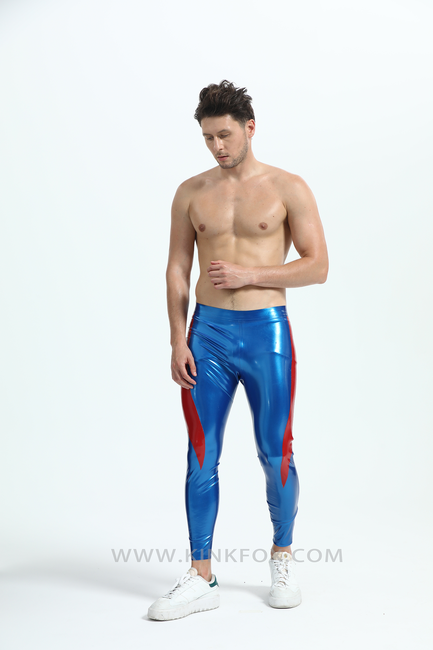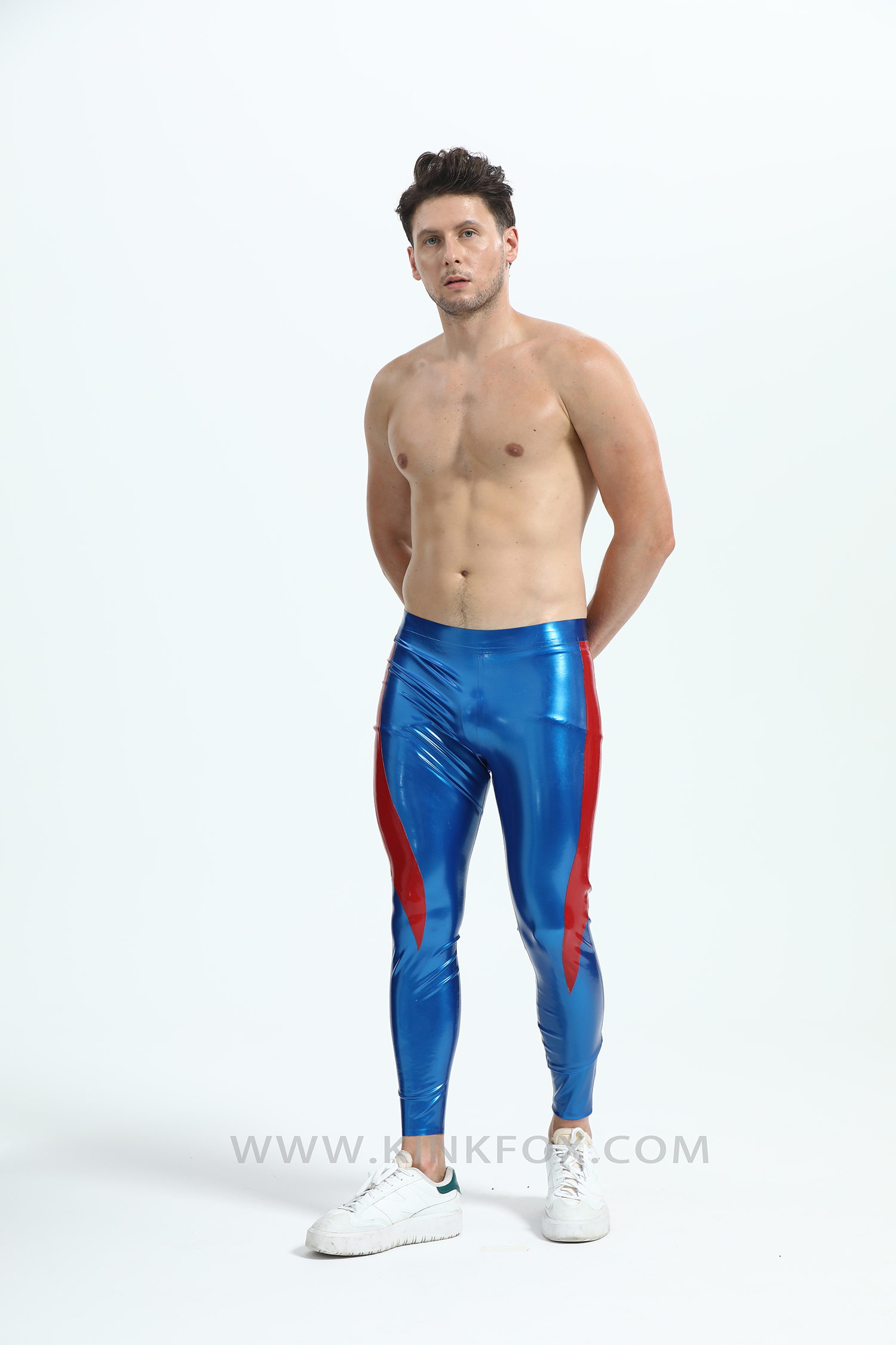 Ignite your motion with Blue Ignition — a fusion of kinetic energy and metallic allure. These high-gloss latex leggings blaze in electric blue, streaked with vivid red panels that carve along the legs like arcs of flame. Designed for speed and precision, the silhouette wraps the body in dynamic tension, amplifying every movement with aerodynamic intent.