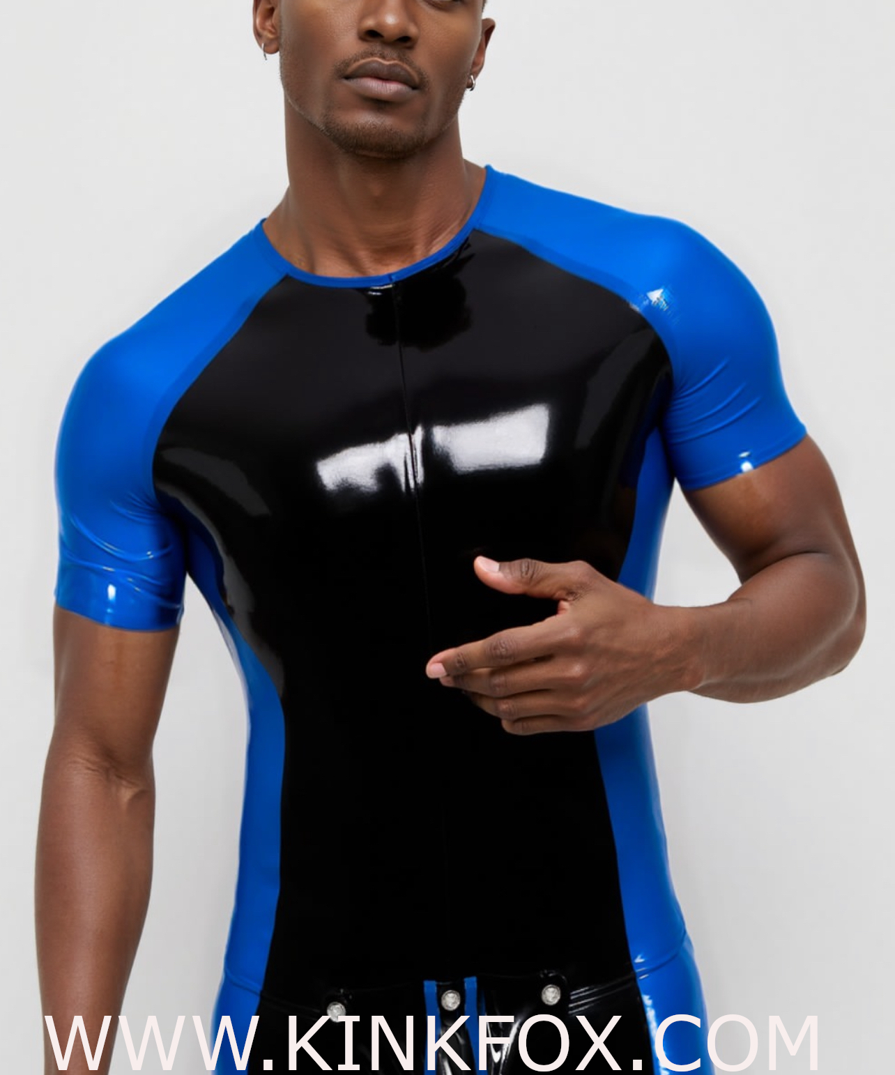 Featuring a dynamic blue-and-black color split, this short-sleeve latex suit delivers a sporty, high-energy look. The glossy finish and ergonomic design make it ideal for active wear or statement styling.