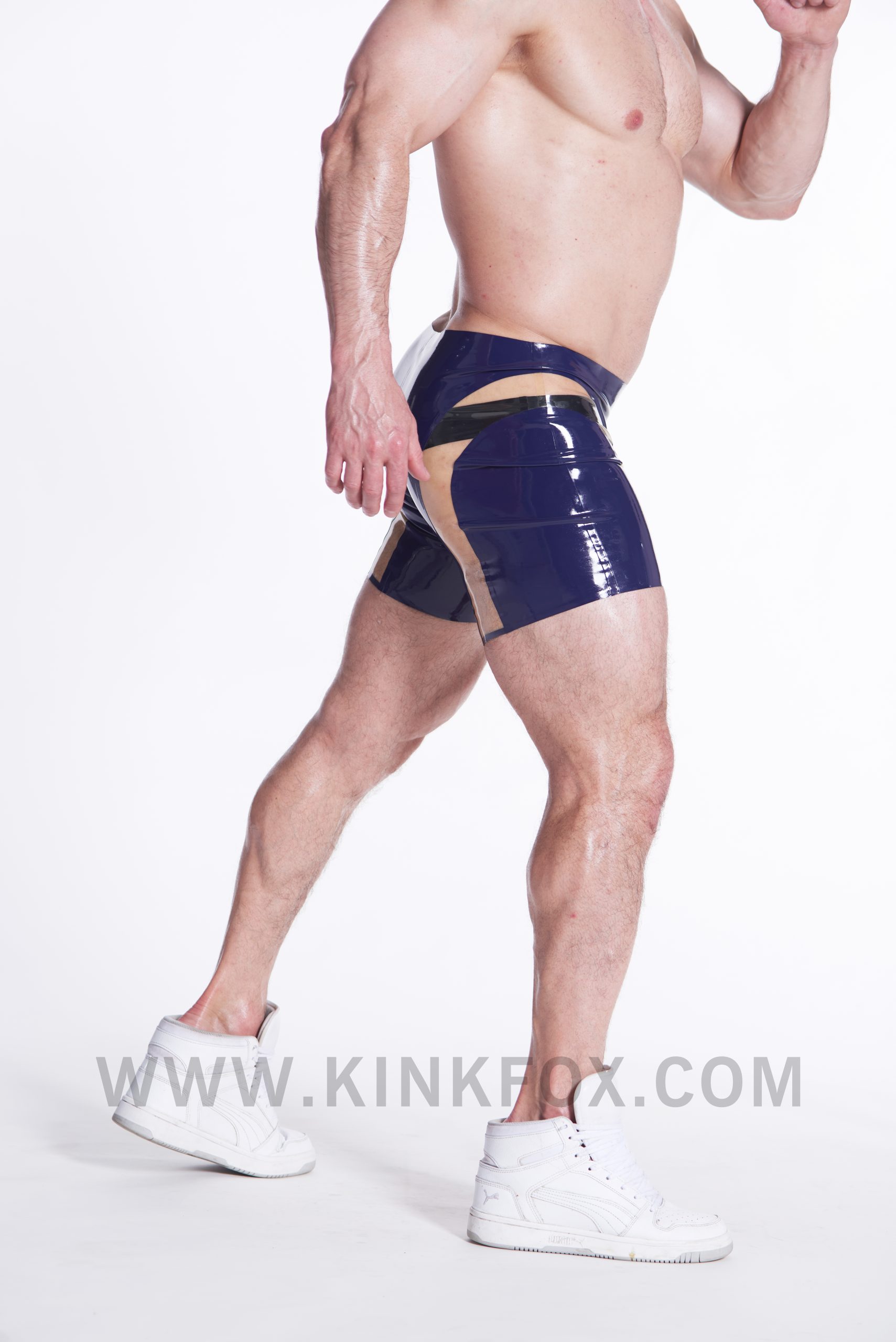 A fusion of mystery and sensuality, these dark blue latex shorts with transparent accents play with perception, teasing just the right amount of skin. Designed for comfort and style, they move with your body, making a statement with every step.