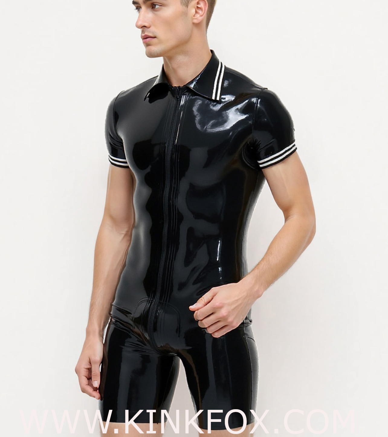 A sleek black latex suit with subtle contrasting trim and a front zipper. Clean, understated, and confident, this design focuses on sharp tailoring and a timeless, masculine aesthetic.