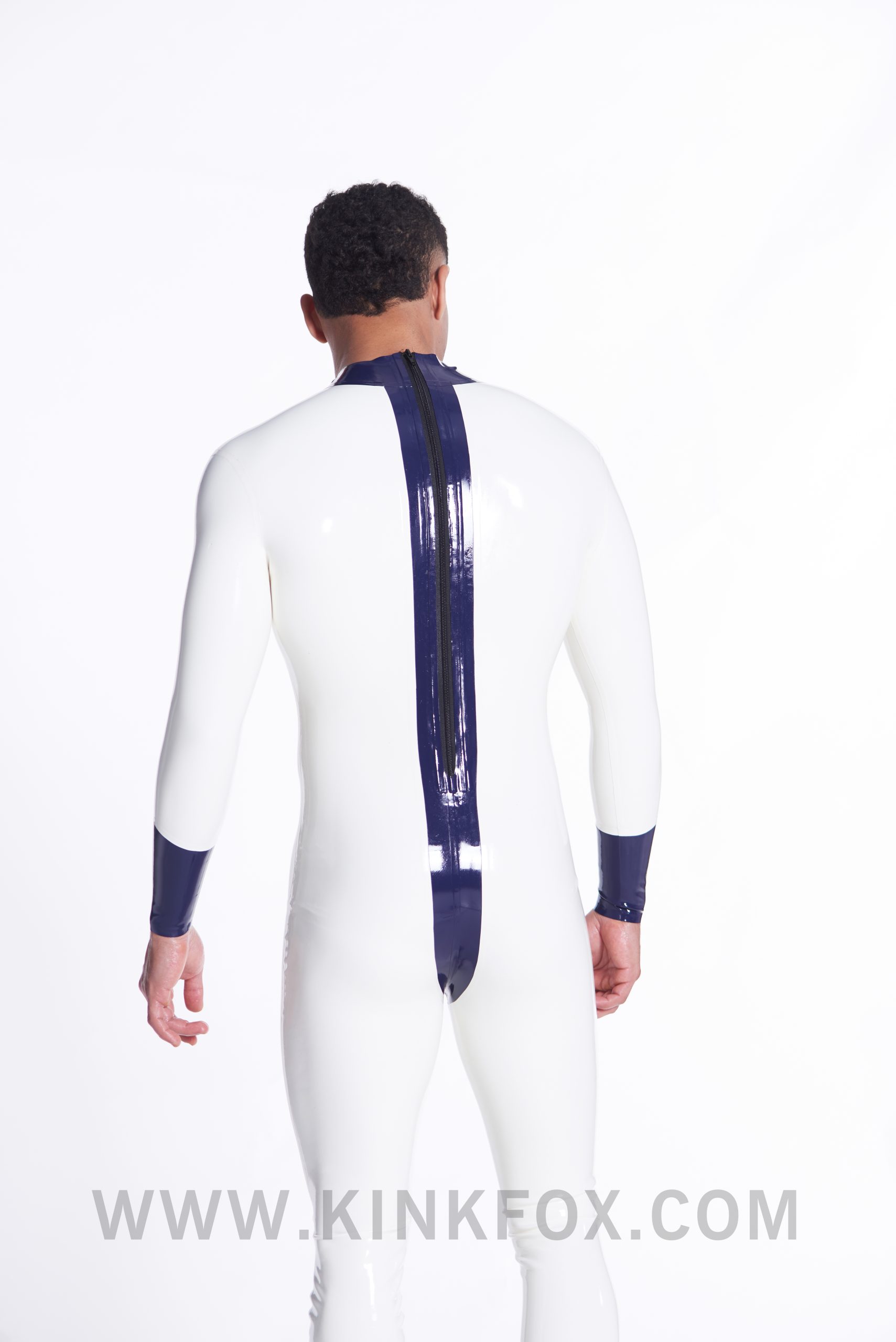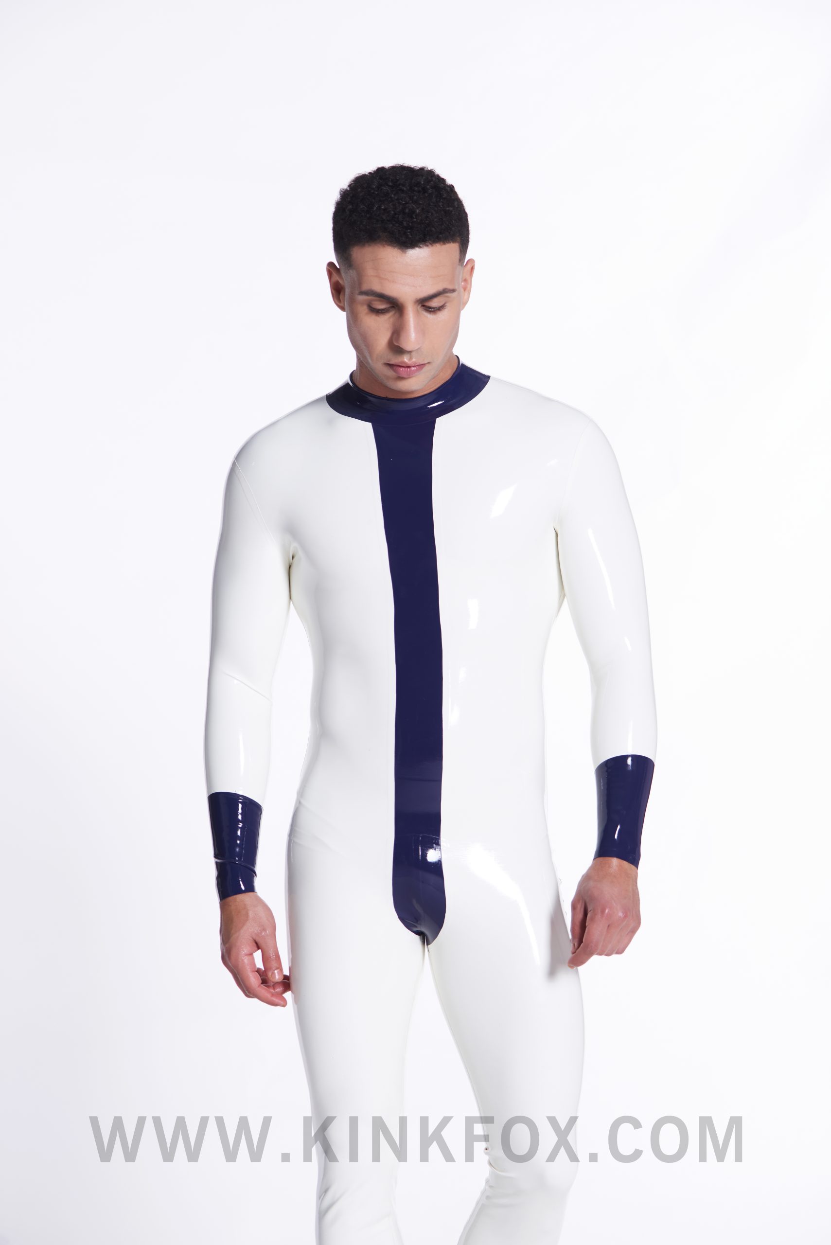 Crisp, cool, and effortlessly dominant, this white latex catsuit with dark blue detailing brings a cutting-edge touch to any wardrobe. The contrast trim enhances definition while maintaining a sleek, second-skin fit.
