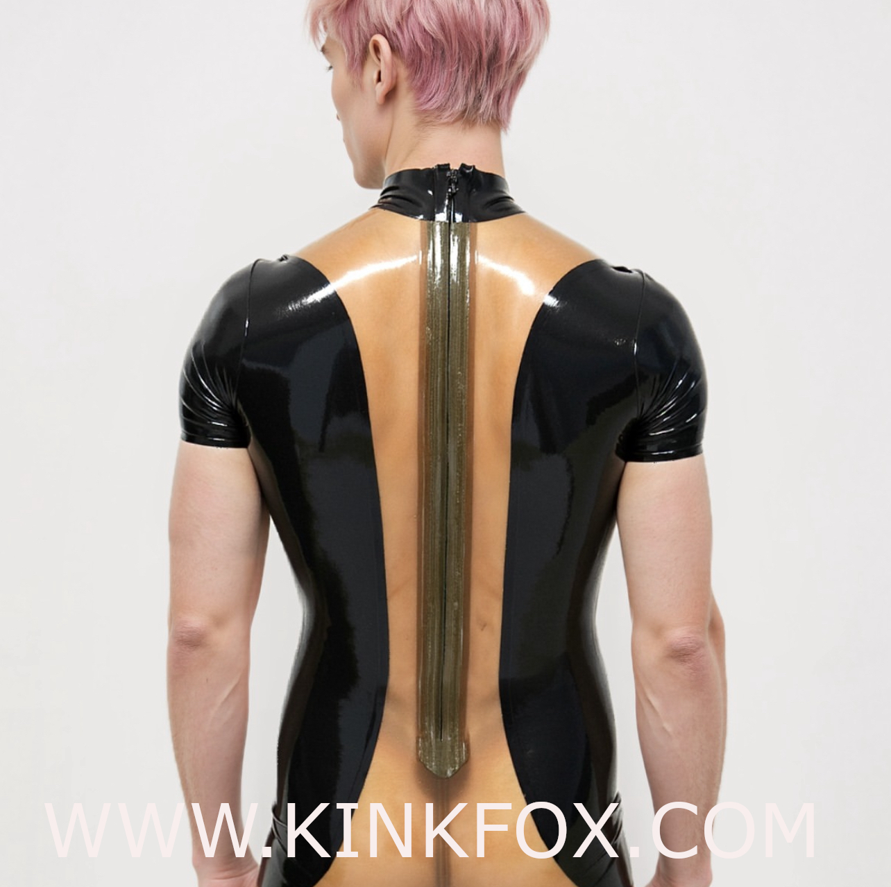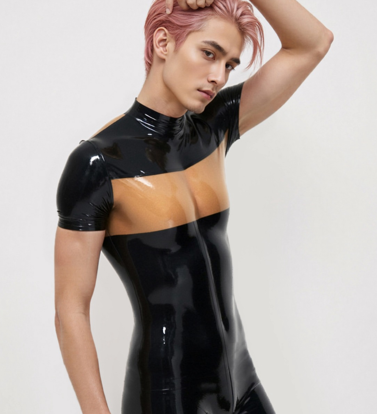 This black latex suit is accented with a bold Transparent-toned chest panel, creating a strong visual contrast. The design balances elegance and dominance, making it a standout piece with a luxurious feel.